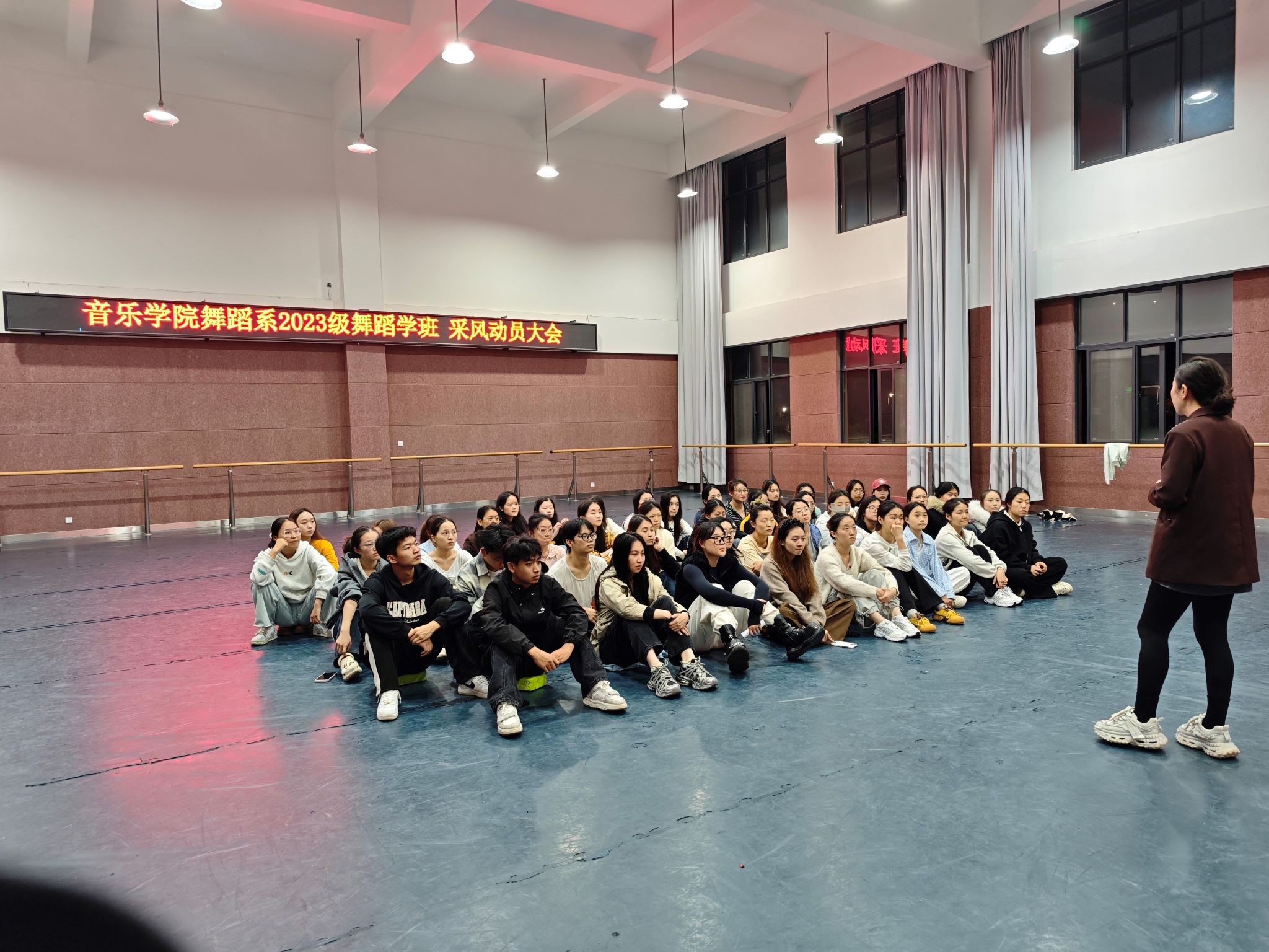 10月8日晚,学院为本次采风活动召开专题动员大会。会上,音乐学院副院长李海燕老师首先阐明了此次活动的核心意义。她强调,采风是是连接课堂理论与鲜活民族文化的重要纽带。她希望全体同学能带着问题深入调研,带着思考学习传承,最终带着扎实的创作素材与深刻的文化感悟满载而归,真正理解舞蹈艺术背后的文化基因与人民情感。 随后,就采风期间的具体行程、核心学习任务、安全纪律要求及后勤保障等事宜进行了详细部署,并针对如何与民间艺人有效沟通、如何系统记录舞蹈动作与文化背景等专业实践方法,为同学们进行了针对性指导。
