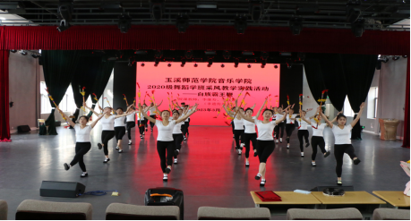 活动中,2020级舞蹈学班的全体同学对采风期间学习的白族霸王鞭和八角鼓进行了汇报演出。同学们用右手持鞭,左手拍、拨鞭的两端,身随鞭移。舞蹈时用霸王鞭围绕身体的主要关节碰击发出的响声和由此引动上身的拧、摆及小腿的变化和双脚的跳动,形成各式各样的舞姿和动作。随着舞步的起落,霸王鞭发出有节奏的、清脆悦耳的响声。