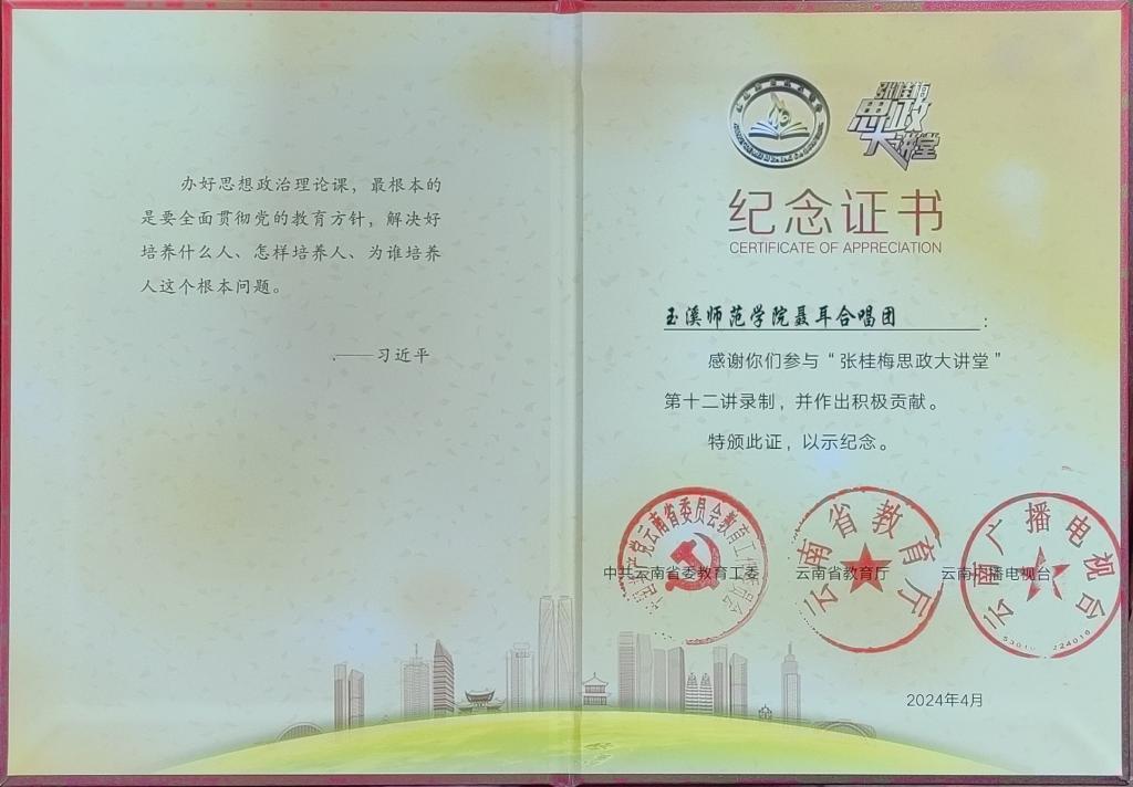 “张桂梅思政大讲堂”第十二讲不仅是一场视听盛宴,更是一次深刻的思政教育实践。玉溪师范学院音乐学院学生们的精彩演绎,让音乐与思政课的融合焕发出新的生命力,展现了艺术与思想教育相结合的无限可能。通过这样的活动,我们看到了艺术专业在传承文化、激发爱国情感、培育时代新人方面的重要作用,也期待未来能有更多类似的创新实践,让思政教育更加生动、有效。