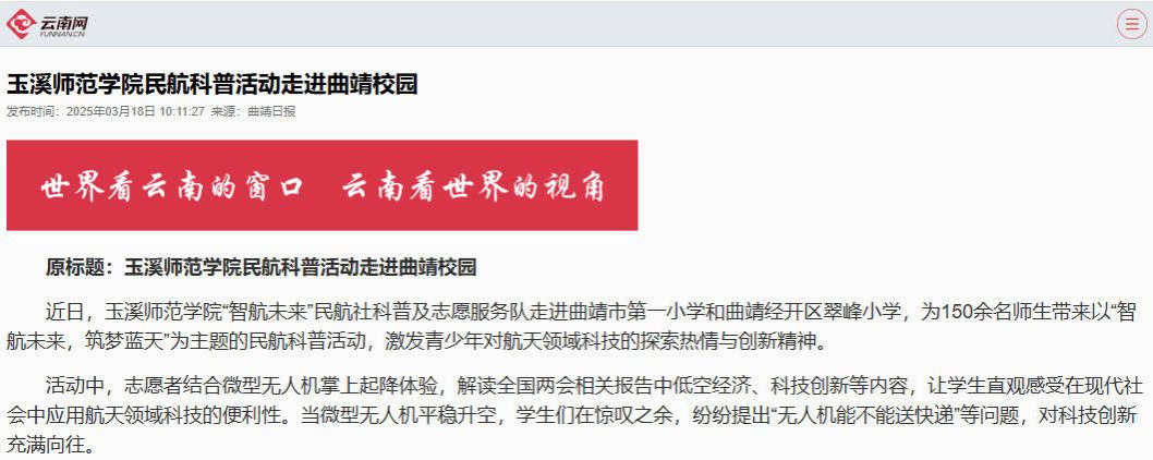 近日,玉溪师范学院“智航未来”民航社科普及志愿服务队走进曲靖市第一小学和曲靖经开区翠峰小学,为150余名师生带来以“智航未来,筑梦蓝天”为主题的民航科普活动,激发青少年对航天领域科技的探索热情与创新精神。
