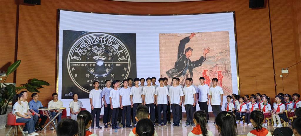 活动以“一座城 一首歌”为授课主题。课堂上,玉溪师范学院马克思主义学院院长、玉溪市聂耳和国歌研究会会长时遂营教授讲授了玉溪精神和国歌精神的内涵,来自各学校的学生纷纷参与到课堂互动中。随后,市一幼的孩子与老师展示绘画作品、讲述聂耳童年故事;江川区九溪镇马家庄小学若水童声合唱团表演了《卖报歌》;市聂耳纪念馆讲解员黄昱悦和李艳琼讲述了聂耳成长故事及国歌创作故事。此外,玉溪师范学院音乐学院的同学们还演唱了聂耳的经典作品,马克思主义学院和文学院的同学们带来了声情并茂的朗诵,时天羽同学分享了全家共唱一首歌的动人故事。