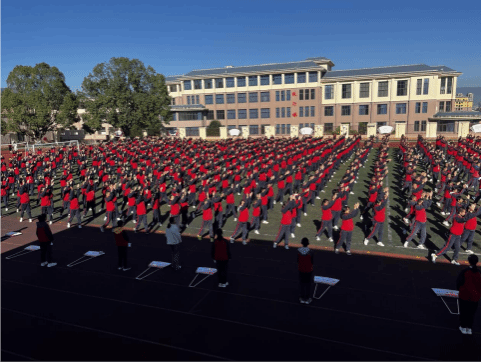 随后,调研工作组实地调研考察了玉溪八中的项目推广开展情况。自2022年项目组成员杨晶晶老师在玉溪市第八中学教授哈尼族民族健身操后,学校学生传习至今。