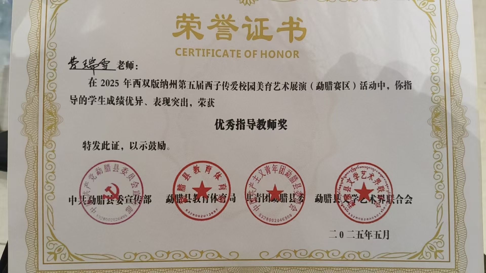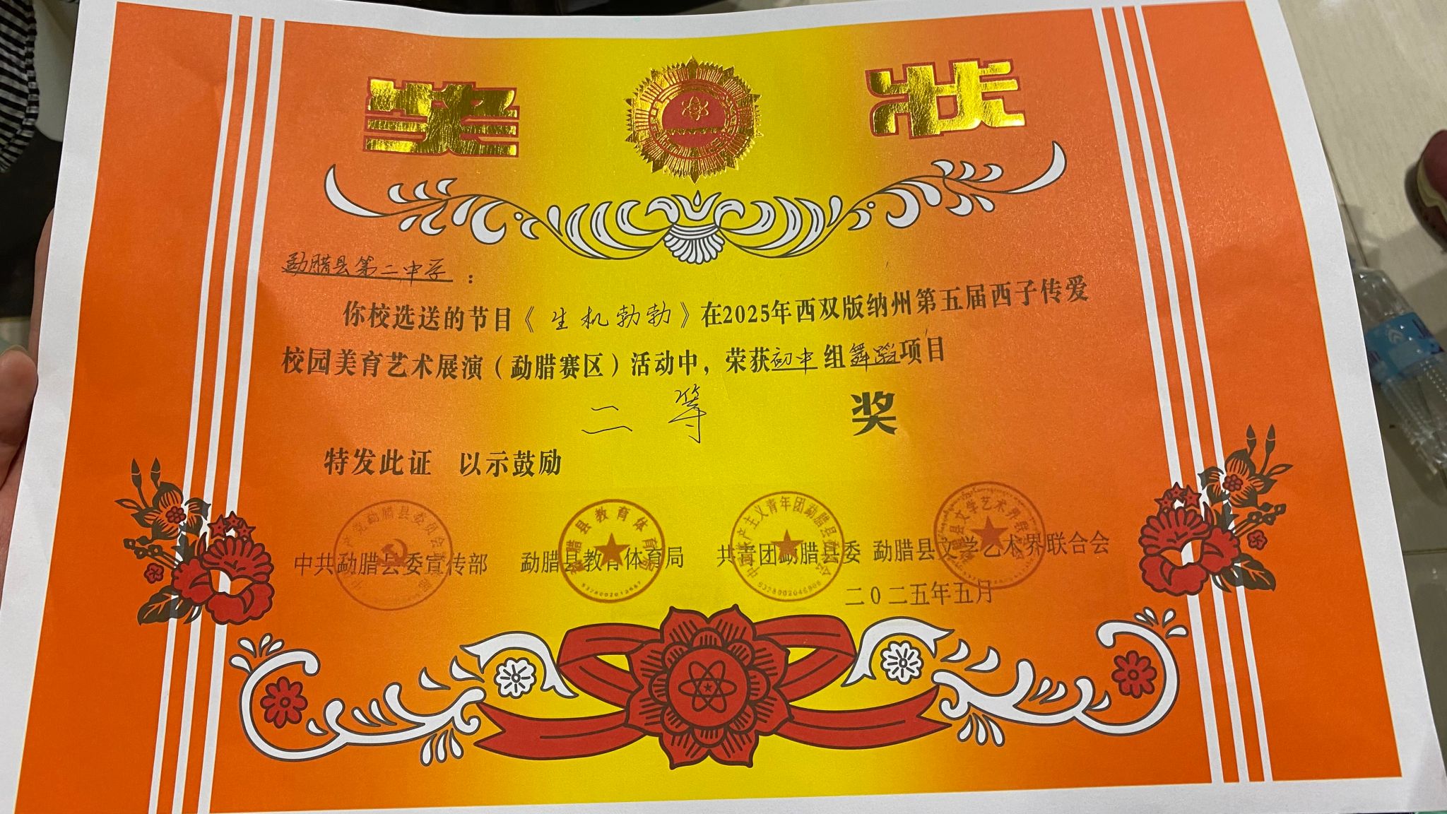 2025年5月十八日早8点30分,勐腊县举办了第五届西子传爱校园美育艺术展演活动,本次活动为落实立德树人根本任务,弘扬社会主义核心价值观,植根中华优秀传统文化深厚土壤,坚持以普及促提高、以提高带普及,引导学生树立正确的审美观念、陶冶健康的审美情趣、培养良好的艺术修养,促进学生德智体美劳全面发展,推进学校美育改革发展。使得多数学校积极参与,在刚刚落下帷幕的活动中我校音乐学院2022级音乐一班参与浸润计划项目的曹瑞雪同学带领勐腊县第二中学的学生们也斩获佳绩。