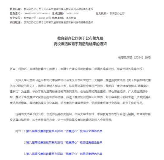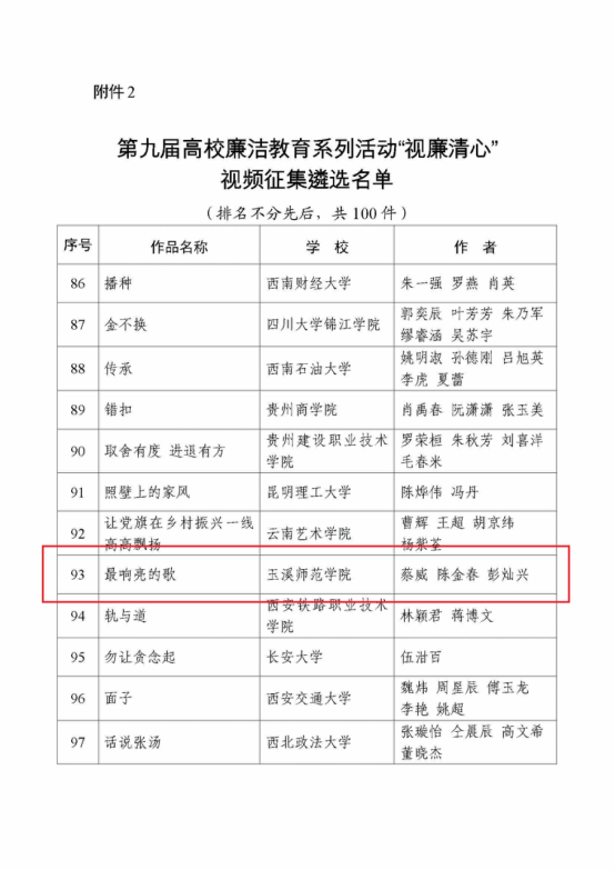 近日,教育部办公厅公布第九届高校廉洁教育系列活动结果,音乐学院教师蔡威创作的视频作品《最响亮的歌》进入本活动“视廉清心”视频征集遴选名单。