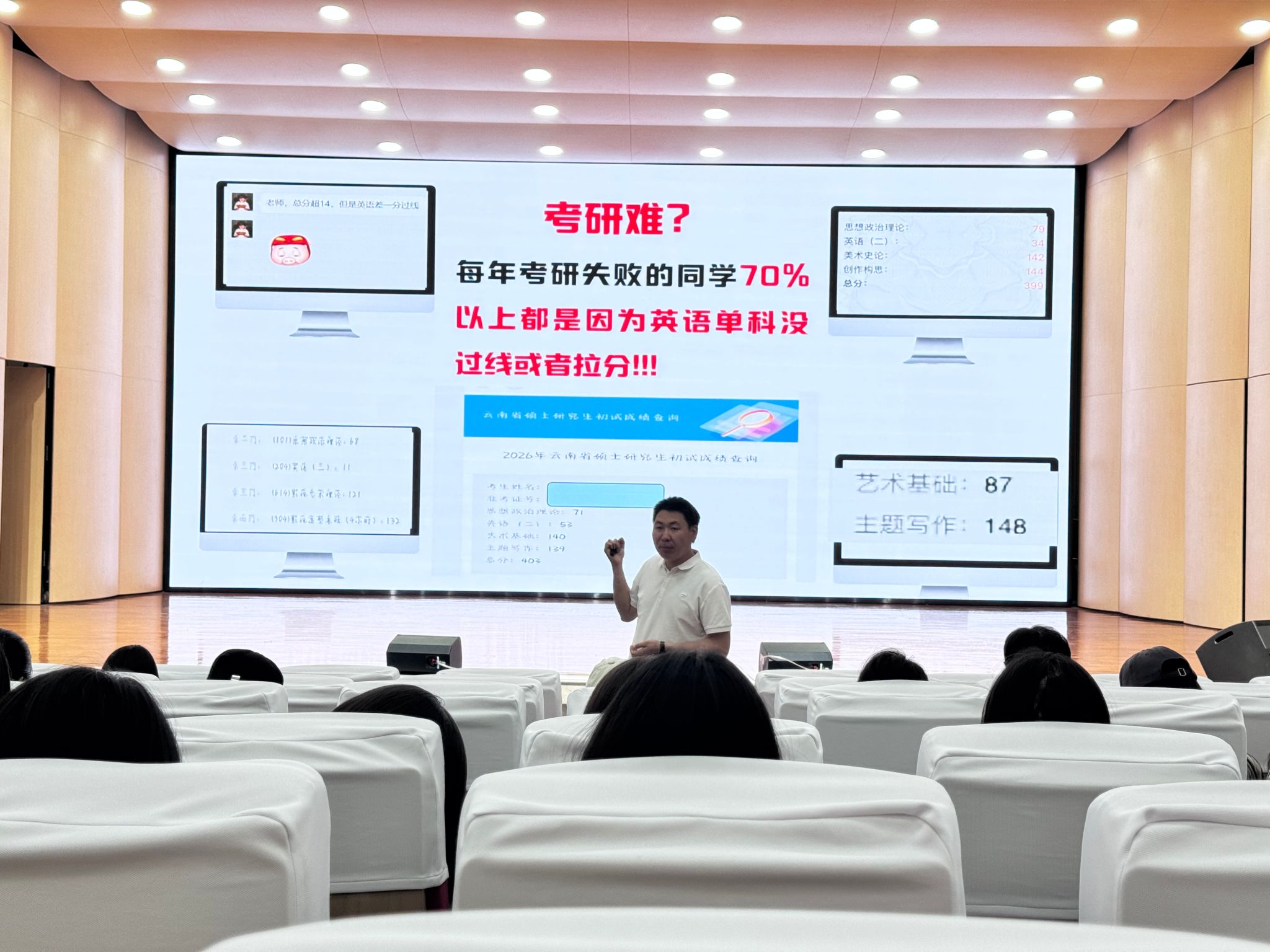 讲座主要围绕报考常识、考情分析、院校选择、报考避雷、全程规划五个方面展开,结合玉溪师范学院近年考研人数、上岸率,以及全国考研人数与录取比例等数据,指出考研是艺术类学子迈向更高平台的重要机会。针对同学们普遍存在的畏难情绪,讲座就“考研现行趋势”“如何高效备考”等问题进行了详细拆解和针对性解答,结合历年艺术类考研真题案例、上岸学长学姐备考经验,用通俗易懂的语言拆解备考难点、梳理答题思路,帮助同学们破除考研畏难心理,明确备考方向,掌握科学的备考方法,同时规避备考及报考过程中的常见误区,为后续有序开展考研备考工作奠定坚实基础。