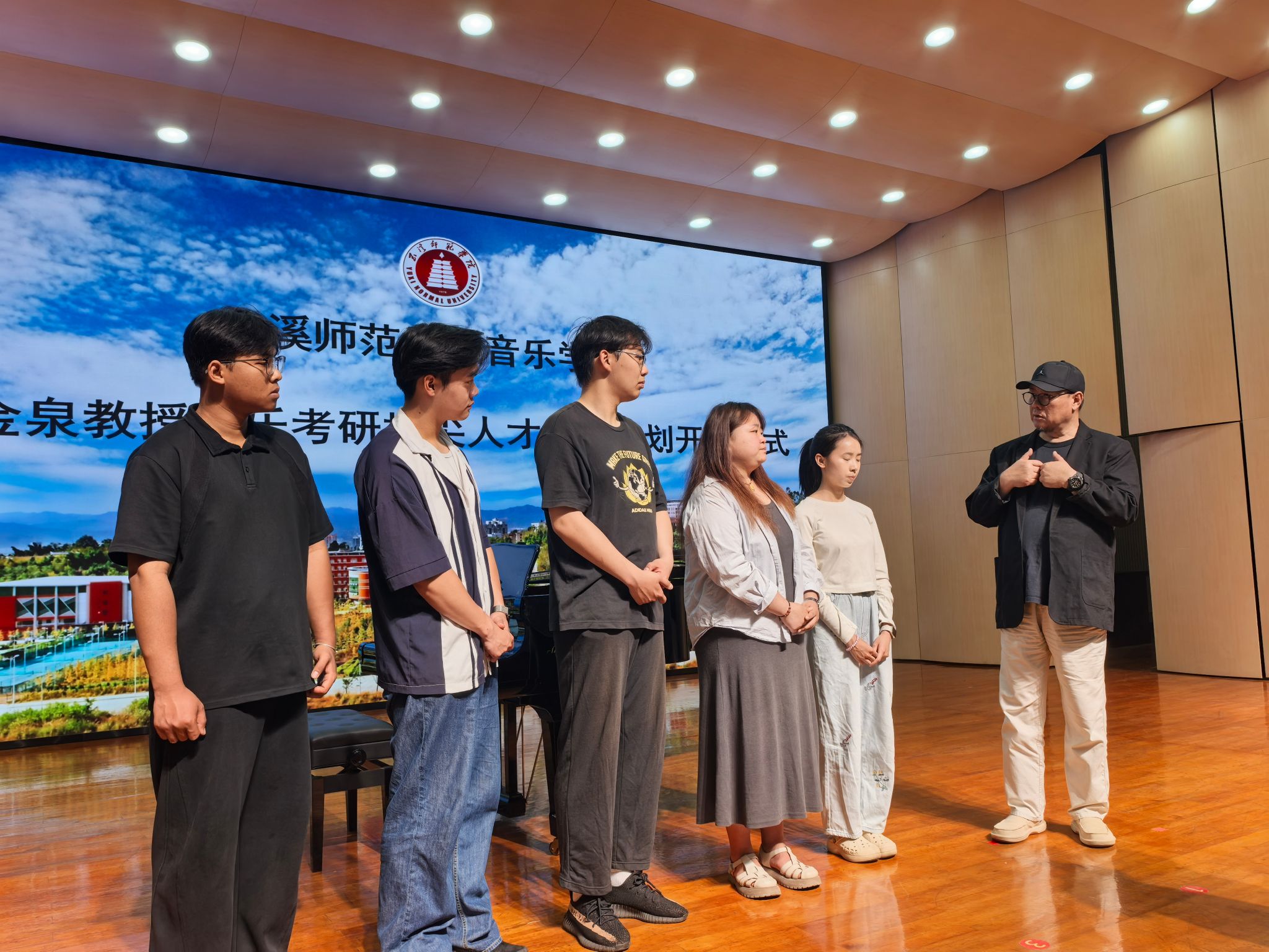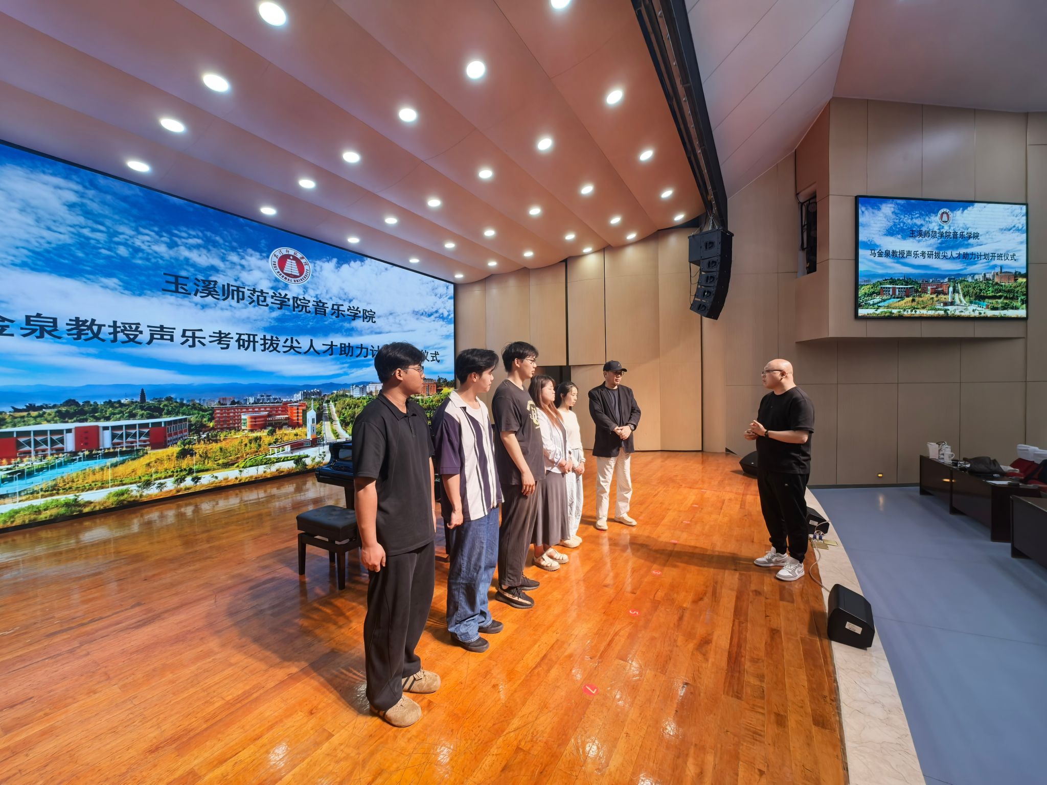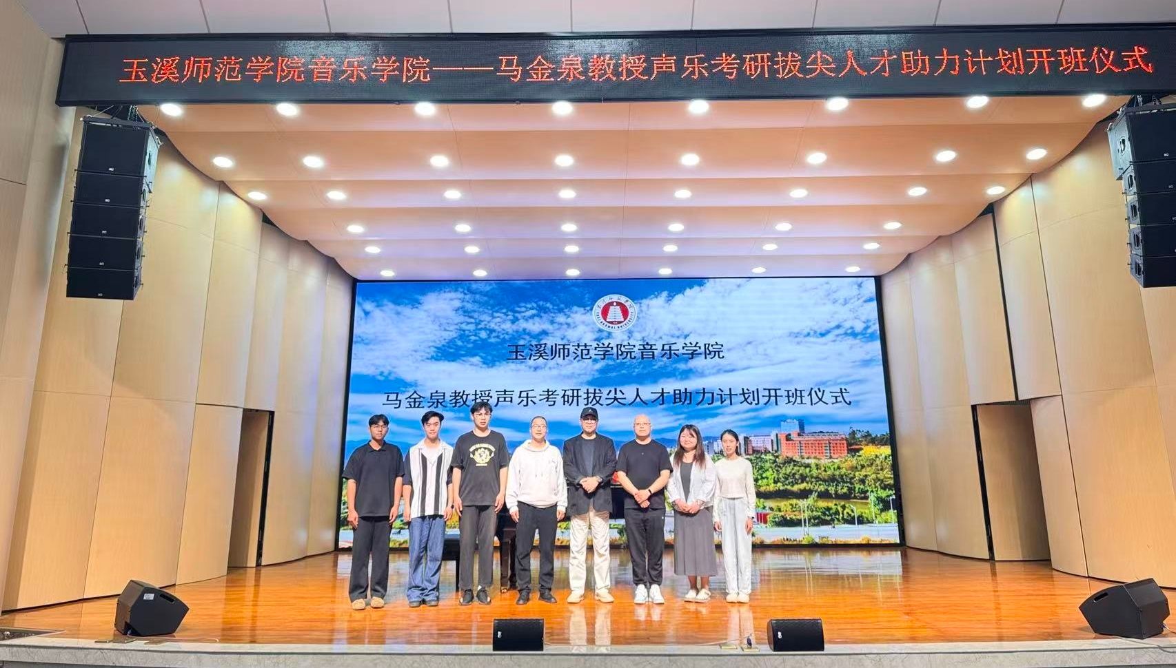 2026年4月17日中午12:30,“玉溪师范学院音乐学院·马金泉教授声乐考研拔尖人才助力计划开班仪式”在音乐学院聂耳演艺厅隆重举行。音乐学院院长范晓晶、副院长蔡威、尹伟老师出席仪式,首批入选该计划的五位声乐考研学生——毕琬聆、孙翊宁、邓媛元、何峪、赵睿郑杨全程参加。